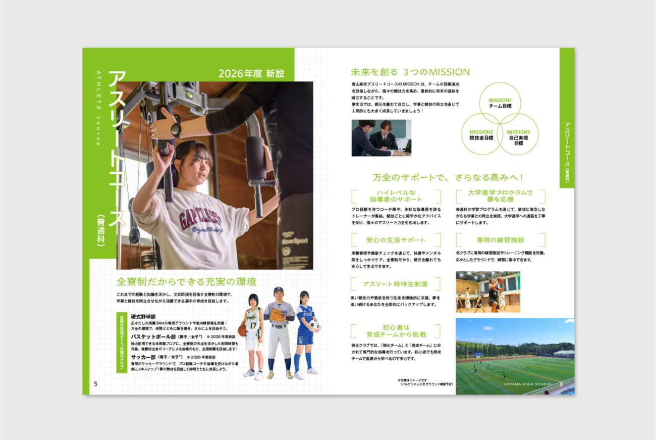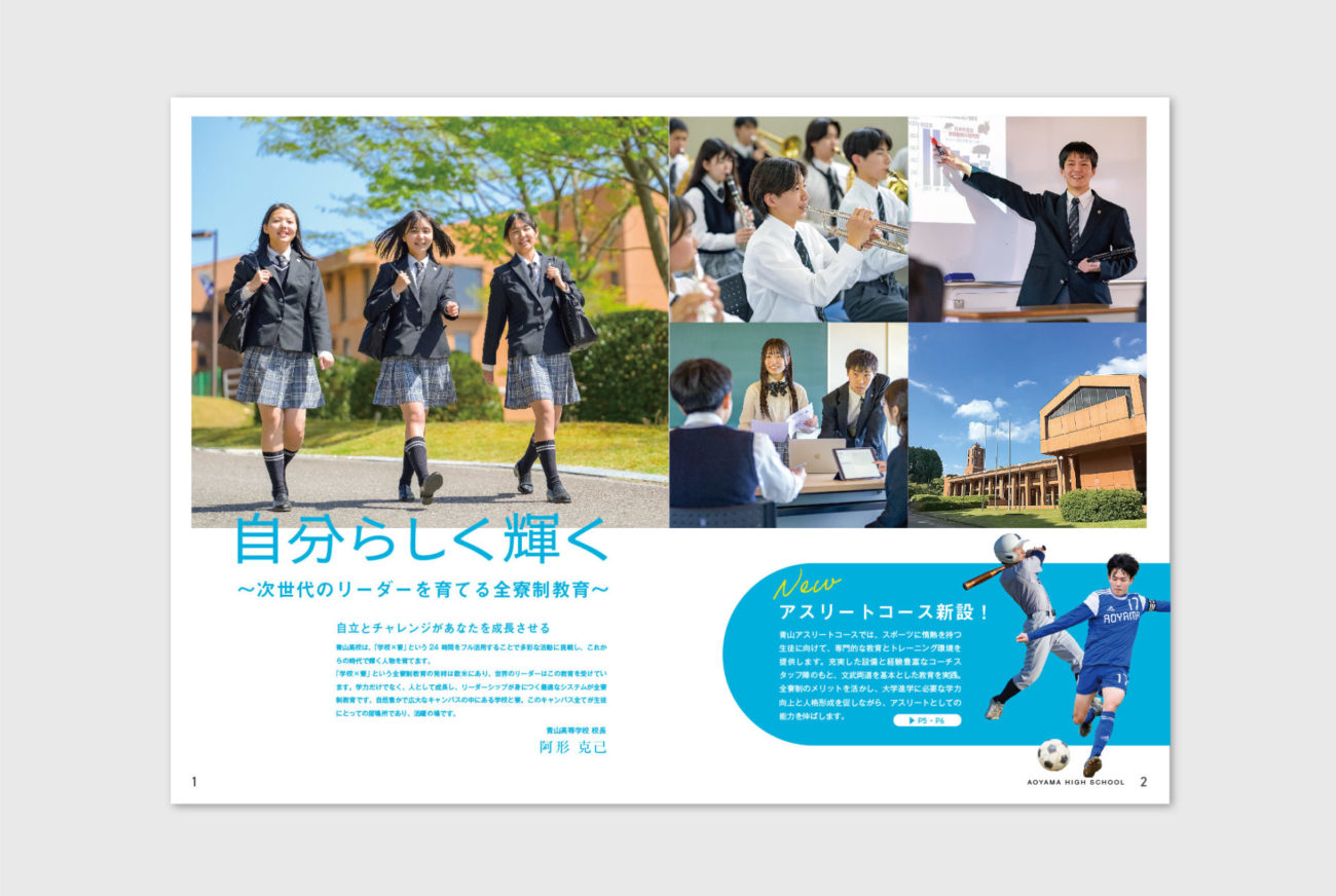 学校案内・寮パンフレット パンフレット・リーフレットについて聞きたい・作りたい 青山高等学校様の学校案内・寮パンフレットを作成しました。 新設されたコースに合わせてパンフレットをリニューアルし、学業と競技を両立させながら活躍できる様子を表現しました。 ・サイズ 学校案内 W:210mm×L:297mm(A4) 寮パンフレット W:182mm×L:257mm(B5) 投稿ナビゲーション フォトブック学校案内・寮パンフレット